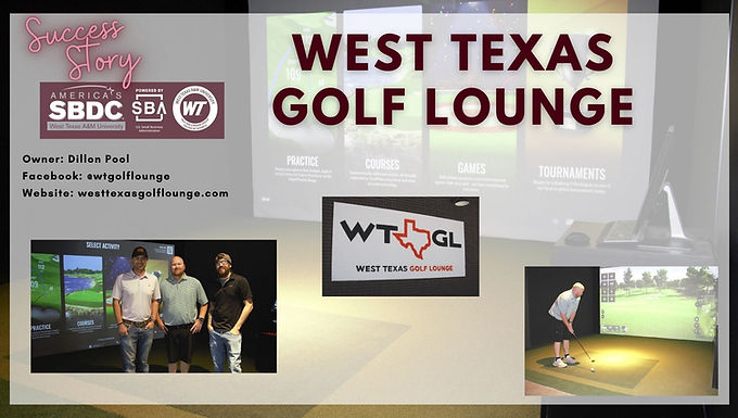 Dillon came to the SBDC in 2020 looking for guidance and assistance to launch his idea of creating a unique experience for customers that utilized his passion for the sport of golf. Dillon worked closely with SBDC Business Consultant Shane Groff who helped him write a business plan, complete financial projections, and create a marketing strategy for West Texas Golf Lounge.